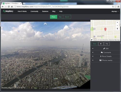 前回書いた"Mapillary”に、空輸中の映像をUPしました。 さながら空中版ストリートビュー(エアリアルビュー?アエロビュー?)。具体的には何の役に立つかなと思いつつ、とりあえず新しい感じがします。 Mapillary "SKYMAP" upload http://www.mapillary.com…